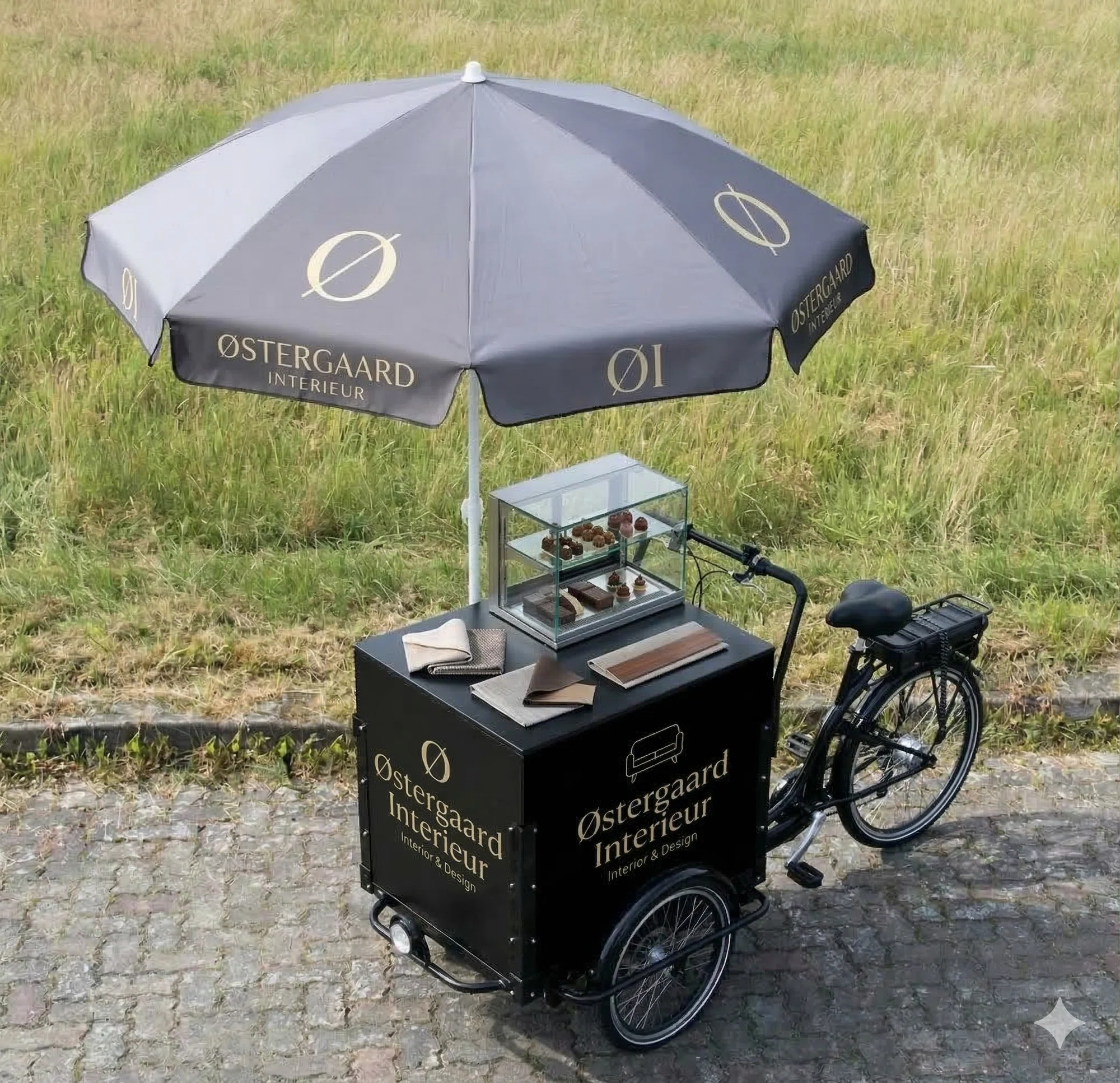 • Andet godt tilbehør som er inklusiv når du køber en cykel: Parasol med logo, folieret skilte til front og sider på kassen, trailer med god plads til opbevaring.