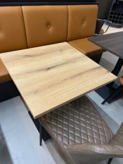 Bordpladen ses her i standardmål, men kan laves på specialmål – så den passer perfekt ind i dit spiseområde.